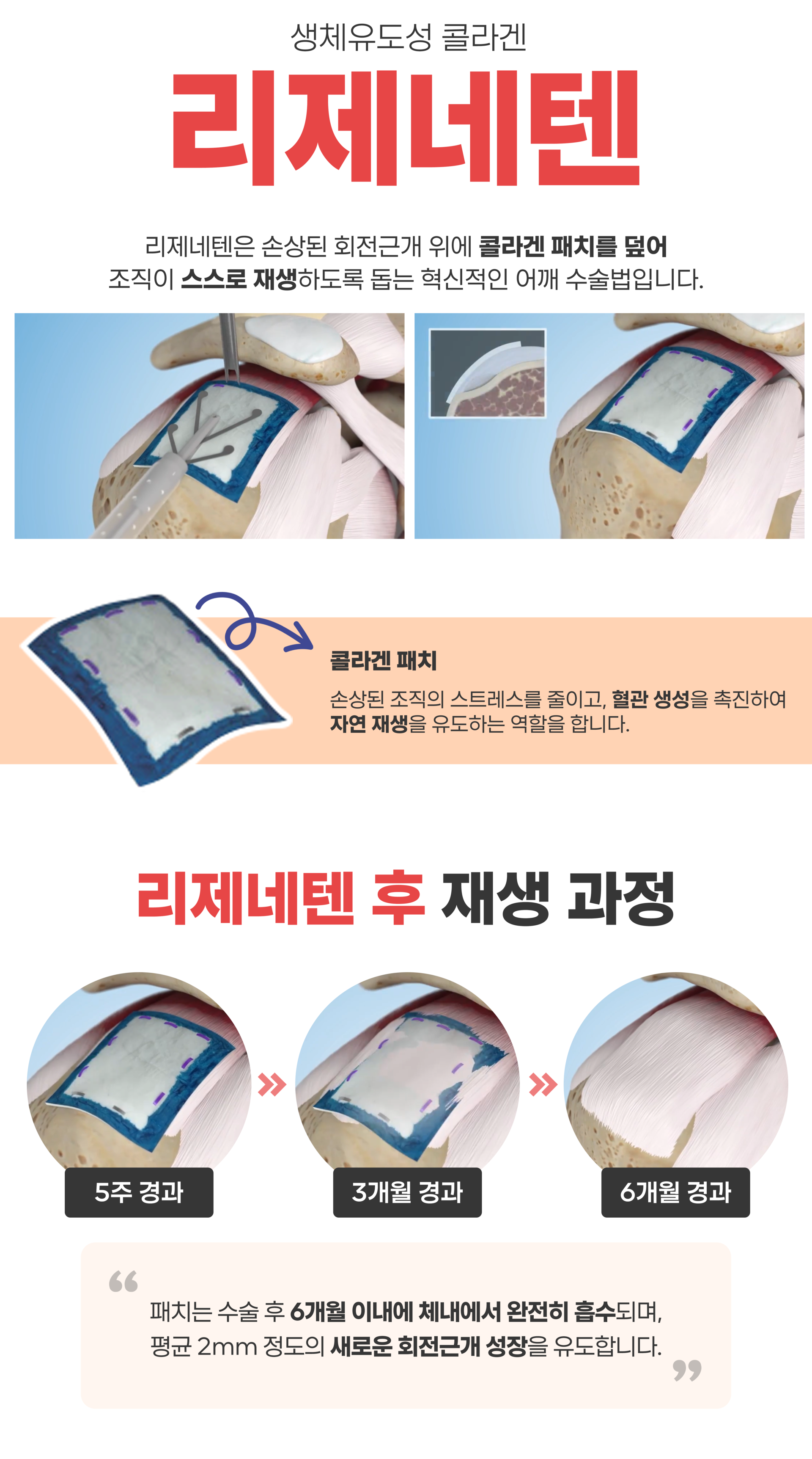 이 수술은 찢어진 힘줄을 꿰매는 대신, 생체 유도성 콜라겐 패치(리제네텐)를 손상 부위에 덮어주는 방식입니다.