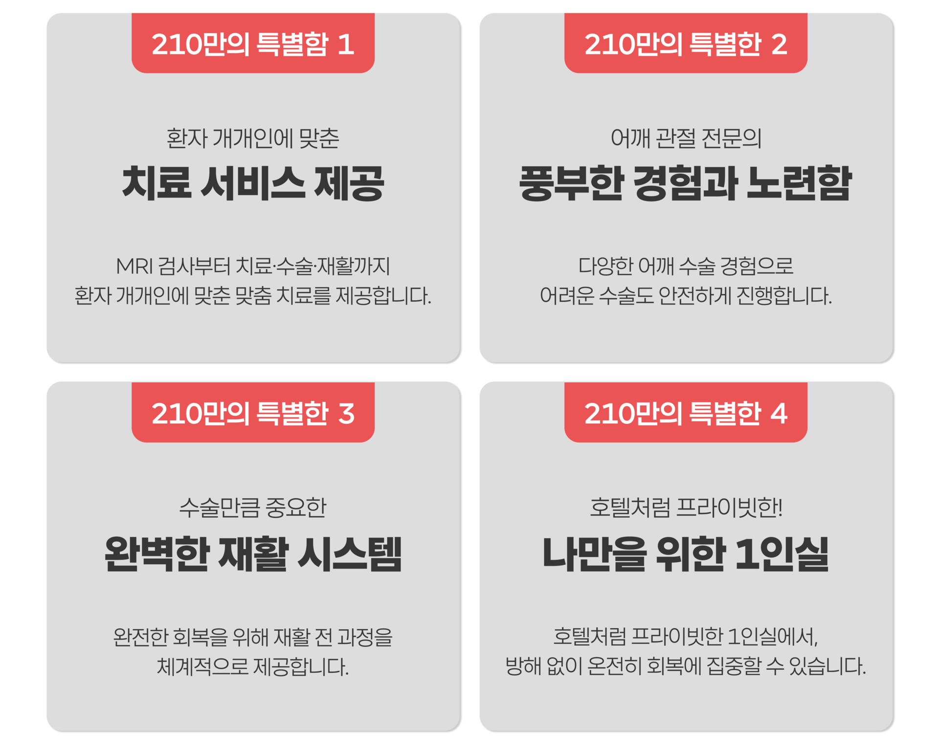 → 물리치료·도수치료·약물치료 등 비수술적 치료를 우선적으로 먼저 시도 | → 리제네텐·회전근개봉합술·동종진피 수술적 치료가 필요한 시점 |