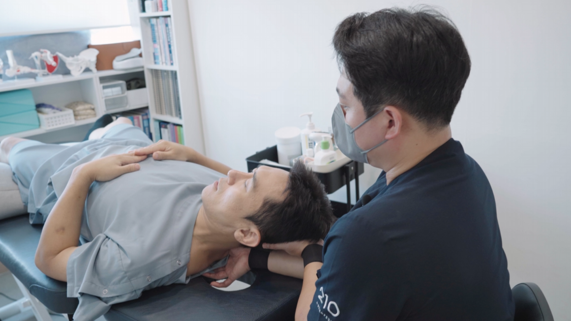치료사의 손을 이용해 굳어 있는 어깨와 주변 근육을 풀어주고