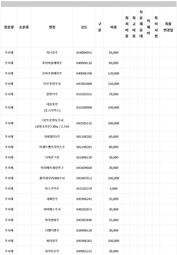 중분류 | 소분류 | 명칭 | 코드 | 구분 | 비용 | 최저비용 | 최고비용 | 치료재료대 | 약제비 | 특이사항 | 최종 변경일 |