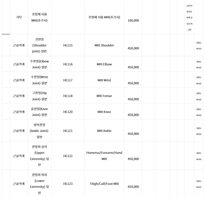 근골격계 | 슬관절(Knee Joint)-일반 | HE120 | MRI Knee | 450,000 | 2025. 04.01 | ||||||
