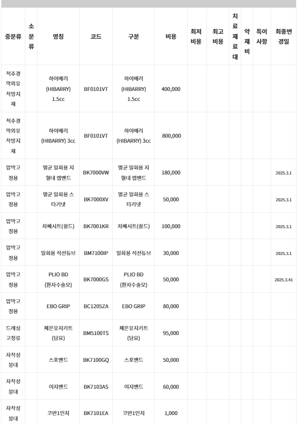 중분류 | 소분류 | 명칭 | 코드 | 구분 | 비용 | 최저비용 | 최고 비용 | 치료재료대 | 약재비 | 특이사항 | 최종 변경일 |
