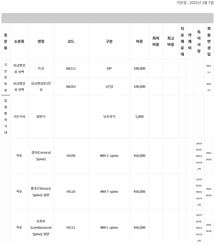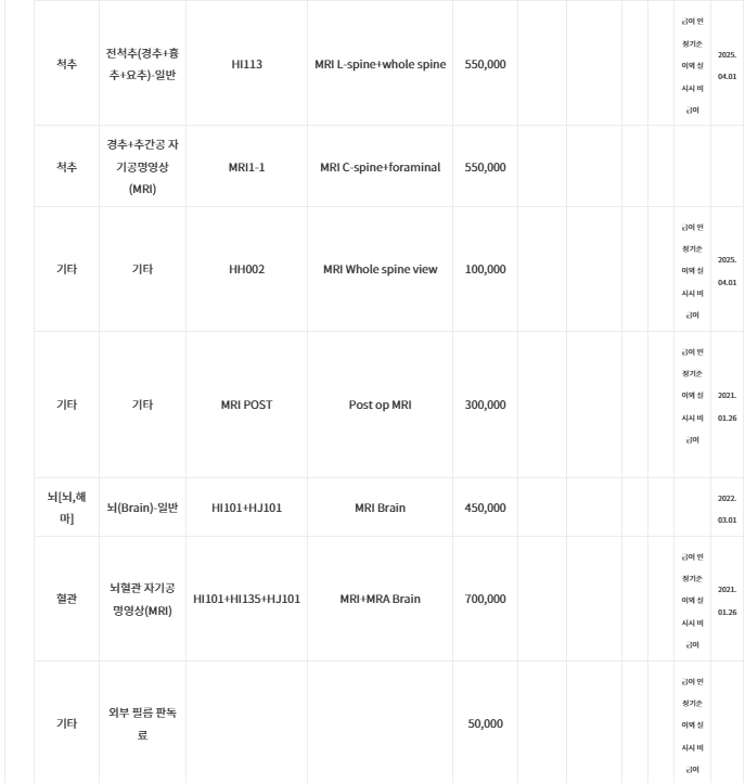 기타 | 기타 | HH002 | MRI Whole spine view | 100,000 | 급여 인정기준 이외 실시시 비급여 | 2025. 04.01 | |||||