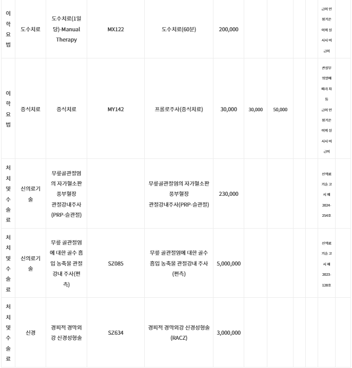 처치및수술료 | 신의료기술 | 무릎골관절염의 자가혈소판풍부혈장 관절강내주사(PRP-슬관절) | 무릎골관절염의 자가혈소판풍부혈장 관절강내주사(PRP-슬관절) | 230,000 | 신의료기술 고시 제2024-254호 | ||||||